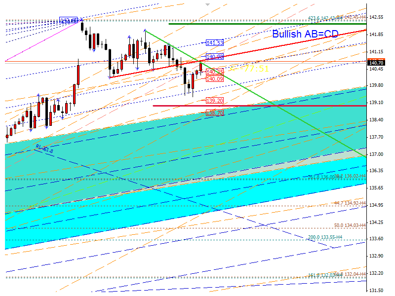 audchf-H4. Пара движется в восходящих вилах, но при этом образовала и нисходящие. При это цена находиться выше восходящей трендовой и как раз уперлась в скопление сопротивлений 0,9715-20 и нижний край канала равновесия. В случае пробоя, откроется путь к 0,9790. Снижение ниже трендовой, опустит цену к поддержке 0,9664, пробитие, которой откроет путь к 0,9608.