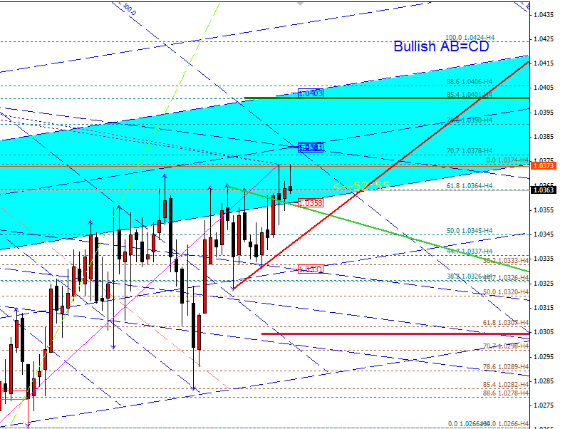 audcad-H4. Как видим пара движется в восходящих вилах Эндрюса. Цена на данный момент находится в канале равновесия, но на Н1 есть медвежий паттерн, который может пробить поддержку 1,0358 и направить пару к 1,0331, а далее 1,0307. Если же пара сможет пробить медиану канала равновесия, то движение продолжится к 1,0403, вплоть до 1,0470.
