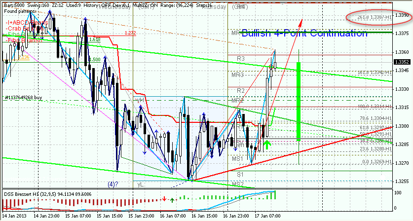 вышли из флэта на север все таки. Быки на текущий момент дотянулись до уровня сопротивления +/- 1,3350. Я так думаю, что от данного уровня вполне возможен отбой и дальнейшее укрепление медведей, но если быки пройдут и закрепятся выше данного уровня , тогда , скорее всего, дальнейшее укрепление быков продолжится. Продажи пока что лучше не рассматривать. Пока так: