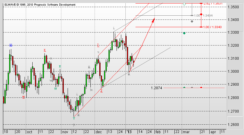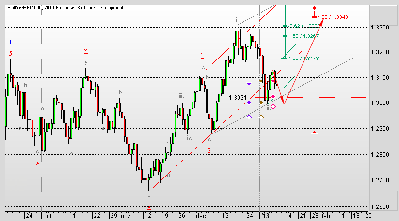 Рассматривая волновую разметку на графике ТФ Н1 можно предположить, что начинает формироваться третья волна в третьей. Но сигналы при для входа в рынок этом отсутствуют. Есть вероятность как уйти с текущего уровня к первой цели третьей волны 1,3343, так и снизиться в диапазон 1,3020 - 1,2990. Целями формирующейся третьей волны, помимо отмеченного уровня 1,3343, могут оказаться уровни 1,3531 и 1,3641.