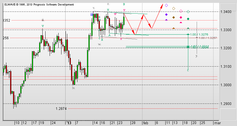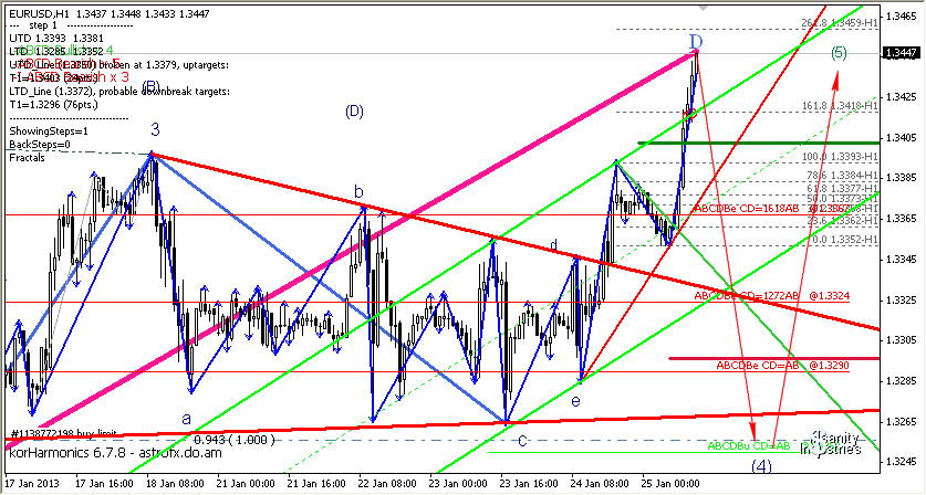 Я уже как-то отмечал, во время формирования сходящегося треугольника (на скрине оставлен, пока эта фигура еще не превратилась в мусор и способна дать полезную информацию), что ценовой выброс будет равен величине большей из составляющих волн. Так и произошло. Однако, там же отмечал, что сходящийся треугольник в данном случае является частью более сложной фигуры - расходящегося треугольника. Исходя из этих соображений могу предположить возможность коррекции к уровню 1,3251. Этим закончится формирование четвертой волны.