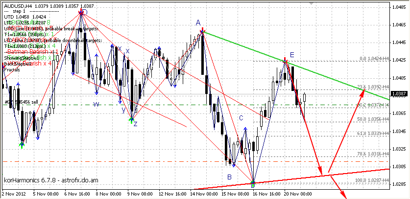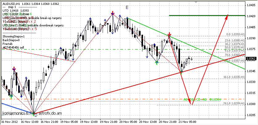 По данной валютной паре медведи все таки дотянулись до целевого уровня +/- 1,0355. На 4-х часовом графике над уровнем поддержки +/- 1,0370 сформировался "Молот". У меня есть такое предположение, что такая же история будет и с уровнем +/- 1,0355 над которым тоже формируется свечка с длинной бычьей тенью. После формирования данной свечки, если она будет бычьей, я так думаю, цена развернется на север, но не факт...имхо