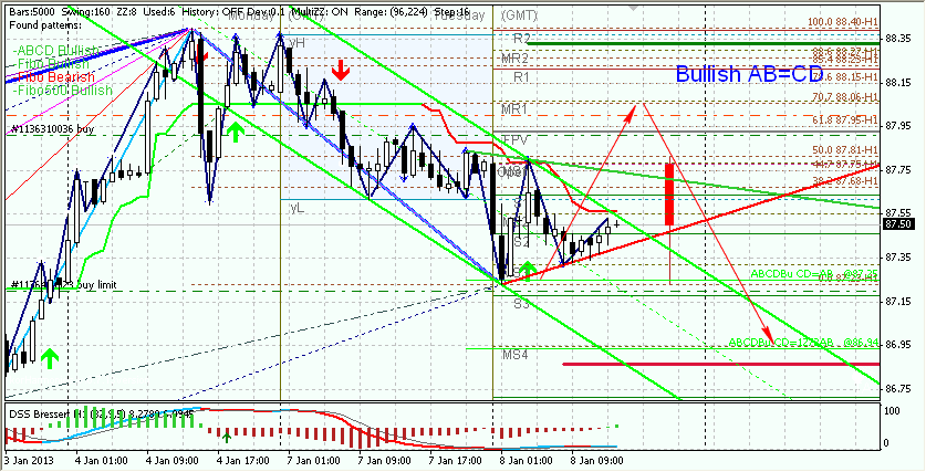 Баксо йена зафлэтила между уровнем сопротивления +/- 88,30 и уровнем поддержки +/- 87,74. Я так думаю, что продажи есть смысл рассматривать только после пробоя и закреплении медведей ниже уровня поддержки +/- 87,31 и трендовой линии, с целью на более глобальной трендовой линии. Новым сигналом на покупку будет пробой и закрепление быков выше уровня сопротивления +/- 88,30: