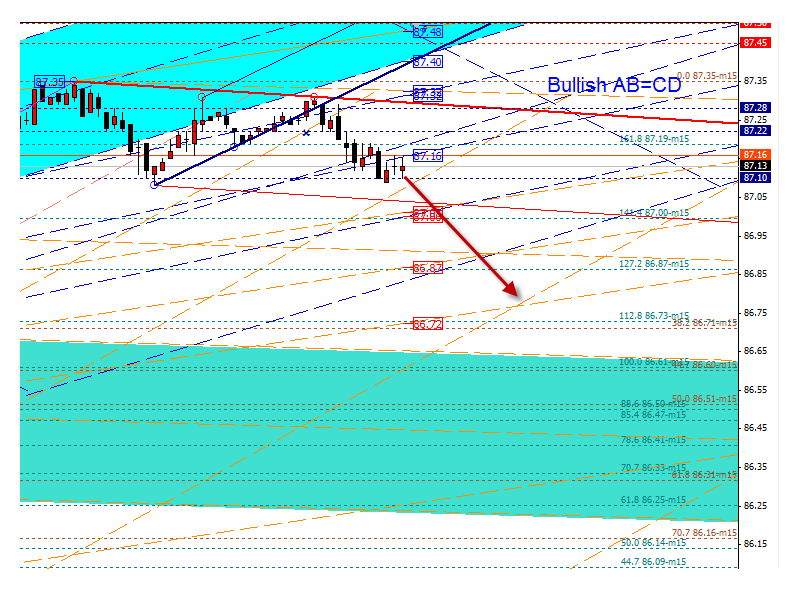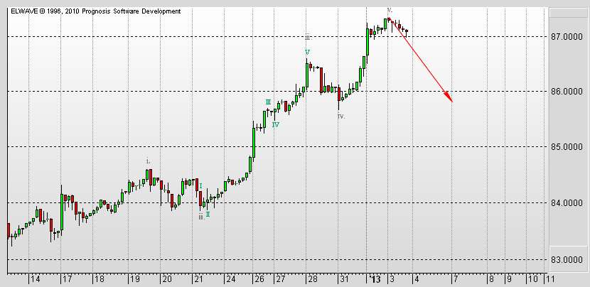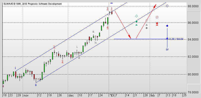 Вообще, пока лезть в сделки по этому инструменту не собираюсь. Покупать на хаях - не самый лучший вариант. Продавать при таком восходящем тренде - слишком рисковано. Хотя и полагаю, что будет откат в виде четвертой волны. Если рассматривать интрадей, то вероятно в диапазон 86,41 (фибо 78,6) - 86,25 (фибо 61,8).