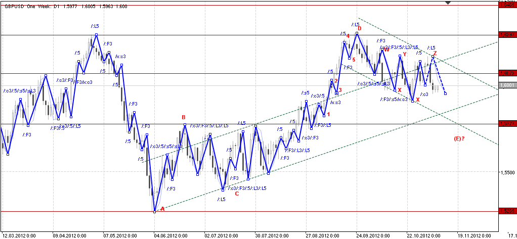 Собственно, в сравнении со вчерашним днем, практически ничего не изменилось. Можно сказать, что цена осталась на тех же уровнях. По прежнему основной сценарий - движение вниз к целевому уровню 1,5777. Т.е. отработка тройной тройки. Дальнейшее движение пока не определено, возможно снижение к уровню 1,5269. Критическим уровнем для этого сценария является уровень 1,6297.
