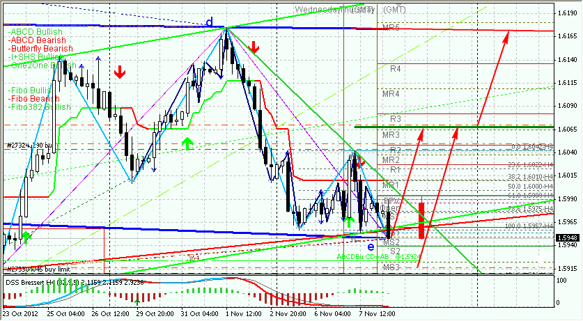 Можно сказать, что цена сейчас находится в зоне равновесия. Критические уровни достаточно далеко. Ближайшие цели просматриваются как для восходящего, так и для нисходящего движения. Но движение происходит в границах нисходящего канала. Вызывает опасения тот факт, что цена не смогла пробить уровень 1,5955 и достать первый целевой уровень 1,5910. Есть вероятность, что началось формирование Е-волны. Исходя из этого просматривается сценарий с возможным разворотом тренда на восходящий. В таком случае ее первым целевым уровнем становится 1,6081.