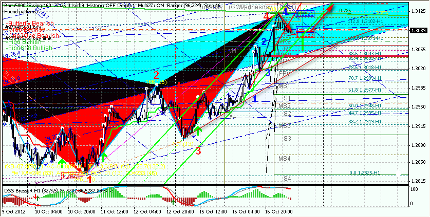 Видно, что получили выход из сужающегося треугольника. Цена отработала полную пятиволновку. Сейчас есть все шансы получить коррекцию. По уровням фибо уровни коррекции могут быть: 1) фибо 100 - 1,3014; 2) фибо 61,8 - 1,2989; 3) фибо 50 - 1,2982. Дальнейшее движение цены после коррекции пока предположить сложно. Поживем - увидим.
