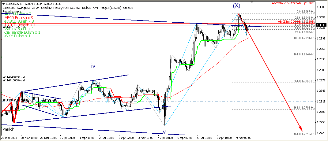![]() По дневному графику изменений по сравнению со вчерашней ситуацией не заметно, а вот по часовому можно говорить об завершении импульса вверх, импульс с удлиненной первой и усеченной пятой. Более того уже сформировались коррекционные волны А и В, уже можно увидеть, что волна С завершится ниже уровня 1.3000. Если же обратиться к Мюррею, то цена никак не могла покинуть торговый диапазон, что может обещать флет. Интересно так же возможное движение по нижнему варианту волны С - такое движение может превратиться из зигзага в импульс, что будет означать движение вниз, которое и прогнозировалось по дневному графику. |