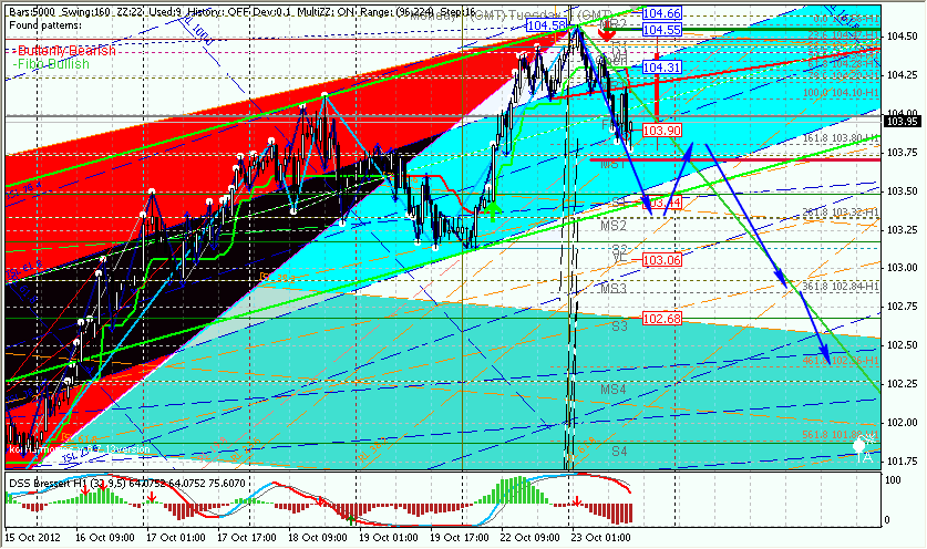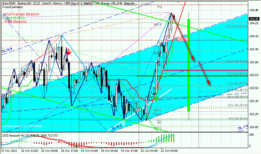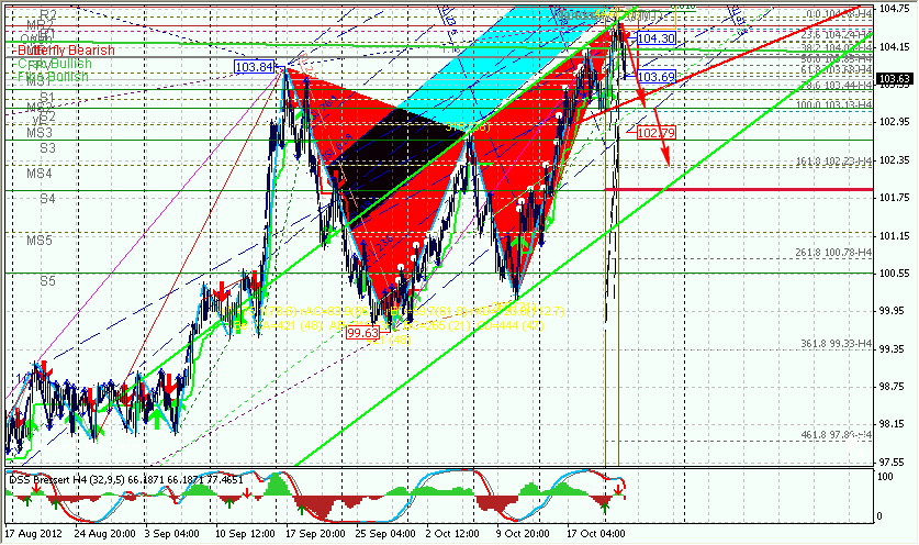 Открыть селл ордера тут возможно в двух точек - первая при завершении волны (В) of [2] предположительно это будет в районе 103.75-104.10 - это вход на опережение, и вторая точка входа, это после завершения локальной коррекции и возобновление снижения можно будет входить при пробое уровня 103,2 Н4 ![]()