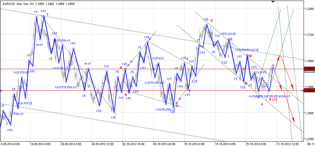 Вот такое место у нас есть интересное. Хотелось бы вернуться под эту трендовую. Тогда спокойно можно было бы дойти к уровню 1,2826 и там уже устраивать коррекцию к той же трендовой. Т.е. все понятно становится. Но есть вероятность и отскочить. Тогда целью становится уровень 1,3070. А это уже близко к критическому уровню, отменяющему сценарий с быстрым снижением.