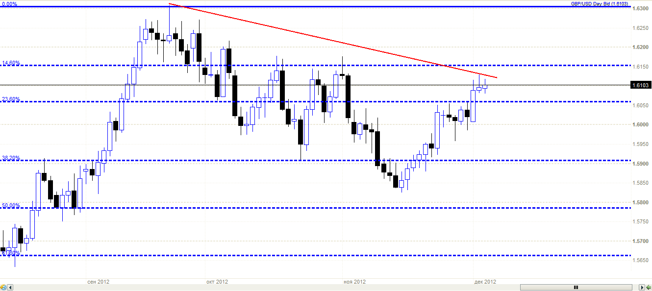 Я полагаю, что выход из этого треугольника - это будет попытка достичь в ближайшем будущем дневной поддержки 1,6031. Ну и дальше, в случае пробития, появляются цели в процентах от роста к последнему глобальному минимуму - 38,2% (1,5788); 50% (1,5682); 68,1% (1,5577). Т.е. потенциал снижения - просто офигенный!