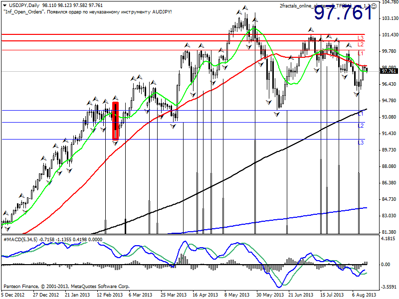 После сильного вчерашнего роста сегодня пара пошла в боковую коррекцию и сейчас испытывает на прочность скользящие аллигатора (отрабатывающие роль поддержки), также заметно что ниже 97.90 (зона 3 нижних фракталов) пару не пускают- похоже там сосредоточились быки, сигналом на покупку должен выступить прорыв сопротивления 98.40 что откроет 99.00.