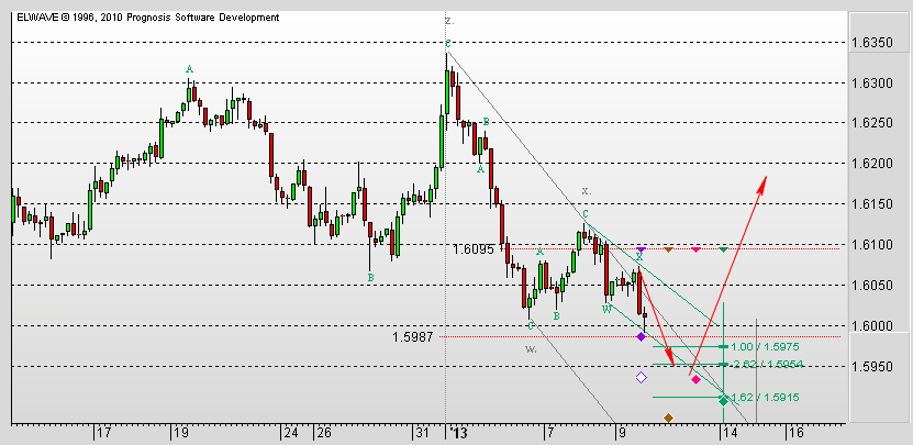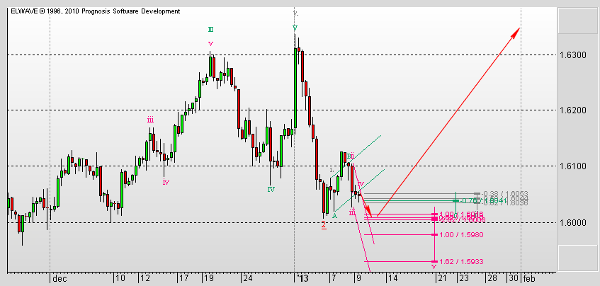 Уровень 1.6 пробит.Таки вчерашнее предположение про АВС структуру оказалось верным.И таким образом видим формирование новой пятиволновки в сторону снижения.коррекция была чуть меньше чем на 38.2%тк что цель можно ловить на 138.2% в районе 1.585.ну плюс минус.