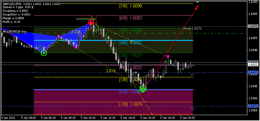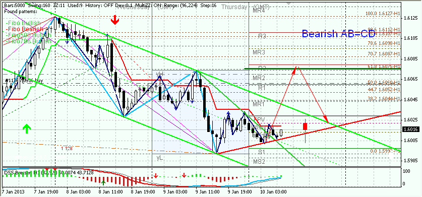 Вырвались все таки из флэта на север, тем самым быки дотянулись до старой трендовой линии, которая теперь линия сопротивления. В любом случае на текущий момент, я так думаю, есть смысл торговать на повышение. Если же мишкам удастся нырнуть под уровень поддержки +/- 1,6027, тогда направление севера может и переломиться на юг. Но а пока что к целевому уровню сопротивления +/- 1,6126: