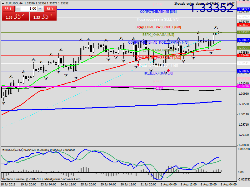 Продолжается горизонтальный тренд с колебаниями между 1.32 до 1.33. Интересно как долго это будет продолжаться. Есть впечатление , что сейчас идет не борьба экономики , а какая-та игра трейдеров. Покупка выше уровня 1.3323 с целью — T/P 1.3373 (1.3341 => 1.3361 (52)) и S/L 1.3284 Продажа ниже уровня 1.3284 с целью — T/P 1.33216 (1.3264 => 1.3228 (46)) и S/L 1.3323 [attachment=26390:прогноз-eur-usd-на-07-08-13.png] |
