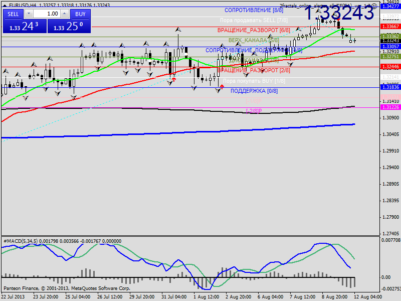 по паре EUR/USD цена в пятницу не смог закрепится над отмеченном уровнем. Сегодня продолжаю рассматривать покупки. На четырех часовом графике все индикаторы продолжают подавать сигнал на покупки. На часовом графике видно, что цена уже развернулся и все индикаторы начали подавать сигнал на продажу. Думаю нужно подождать по этой паре, но и можно рискнут с малым лотам. Рекомендую покупать выше уровня 1,33455 с стопам 1,33260