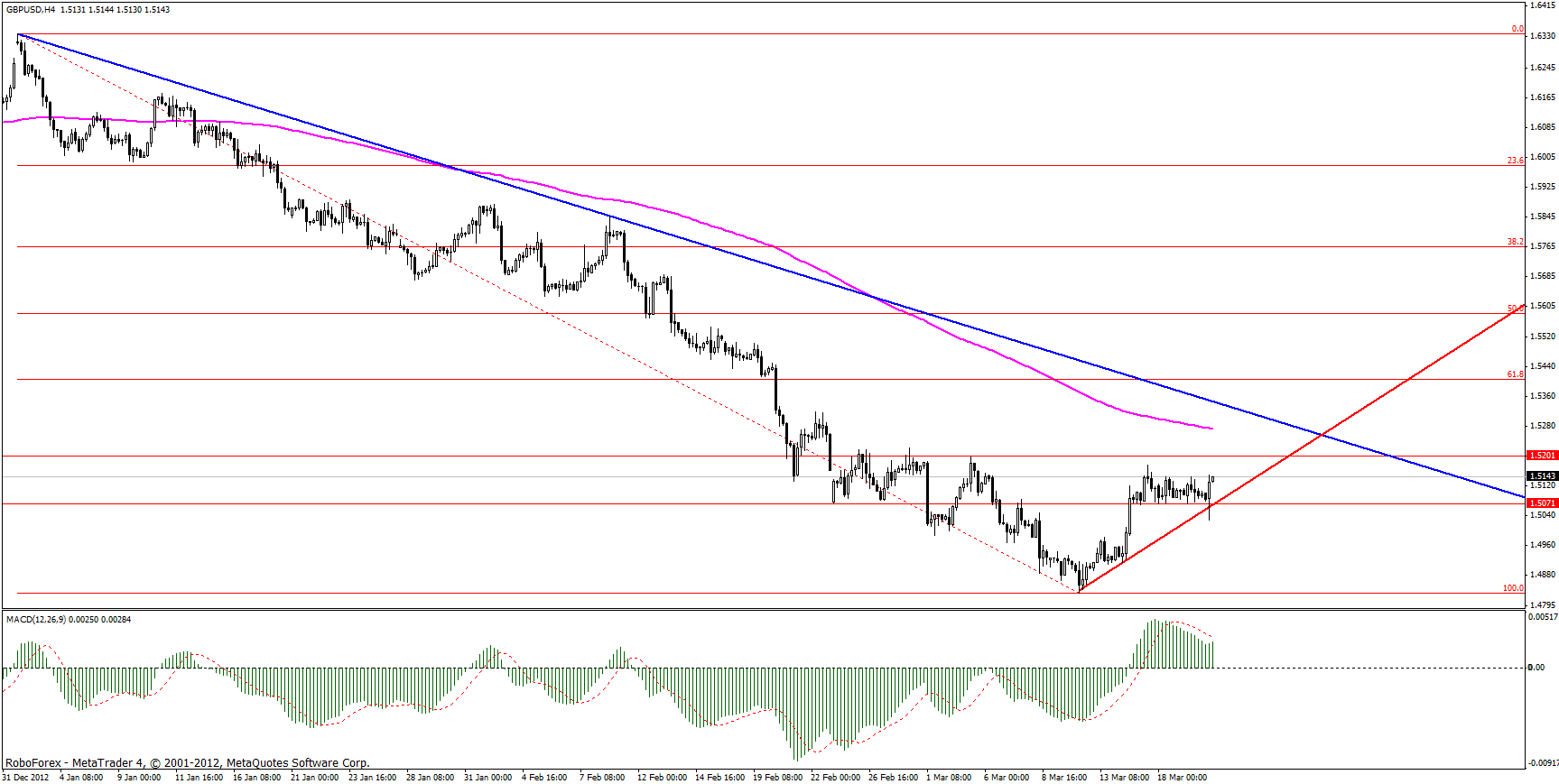 [/url]Сейчас открыл покупку по британскому фунту с 1,5030, как по мне, то цена очень хорошо двигается к уровню Фибоначчи 61,8 на 4-часовом графике это явно видно, но прикол в том, что классических уровней технического анализа там нету, так что тут явно до 50 должен пойти британец, если конечно трендовая линия не помешает. Вот как раз 61,8 у меня и стоит как уровень тейк-профита. |