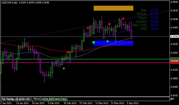 Изложу своё виденье ситуации USD/CHF - ТФ Daily, можно отметить медвежий свечной паттерн "Три дня изнутри вниз" Это подтвержденный медвежий паттерн Харами. Нужно что б цена находилась возле уровня сопротивления. Срок жизни свечной конфигурации 6 баров.