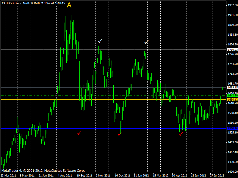 На даный момент золото опять формирует флаг - торгуется на уровне 1733 - так скоро и до 1800 дойдем - а вот потом уже сложнее будет - толи дальше по тренду идти толи опять во флэт по дейли - вот это будет самая большая проблема .....