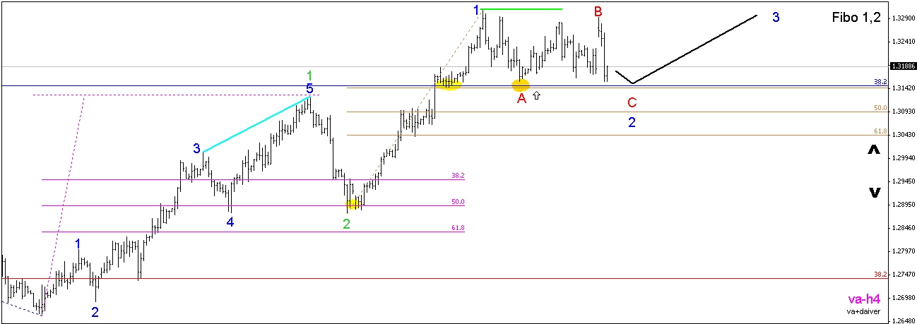 По евро-доллару пока трудно определить в какой фазе находится рынок, но локально мы видим что восходящая коррекция близка к завершению. Цена подошла к уровню 38.2 по фибо, от предыдущего локального снижения, а волна С уровнялась по длине с волной А.