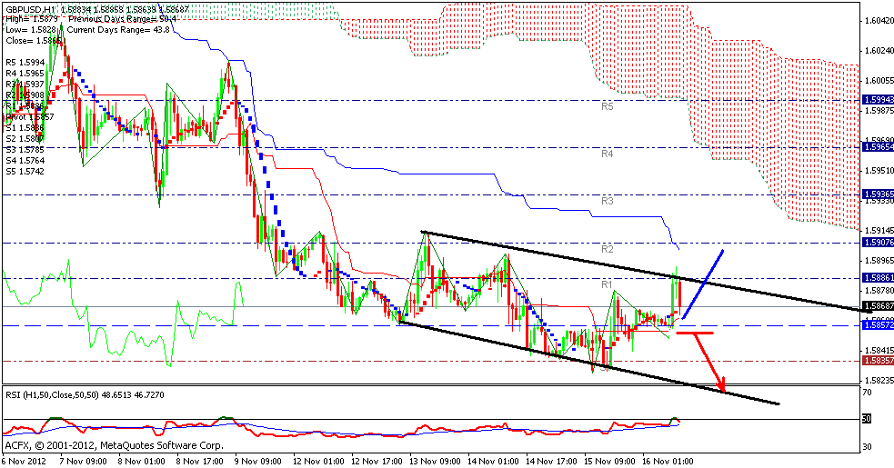 на дневном графике видим что цена выпала из облака, а это сигнал к нисходящей тенденции, которая уже идет. Цена достигла нижней канальной линии и отбилась от неё сформировав две бычьи свечи. Рост пары может продлиться до тенканной линии и нижней границы облака 1.5940, а затем или отбой от облака и падение на 1.58-1.5770 м возможным ходом до 1.5755. В случае пробоя облака следующее сопротивление линия тенкана 1.6000