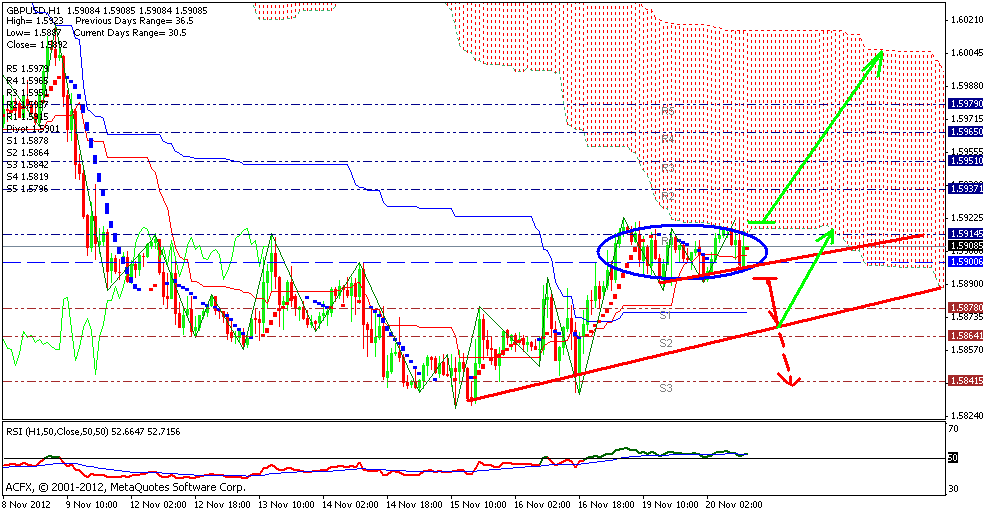пара находится долгое время во флете и зажата на часовом ТФ между границей облака и линией тенкана. При пробое границы облака 1.5917 у пары открывается горизонт роста до верхней границы зоны неопределенности, которая обозначена уровнем 1.6. В случае снижения ниже тенкана и уверенного котирования на данном уровне пару ожидает понижательное движение вниз с многими остановками - кинжут 1.5875 , трендовая - 1.5860 и наконец лоу 1.5830