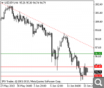 Если детально и по сути: предположительно закончился пятый импульс в составе волны А и складывается предпосылка для формирования начала волны В. Одно из возможного - волна В сформирует вторую вершину. И в этом, как я писал на прошлой неделе, есть желание поучаствовать... :-) Но сегодня это только предположение. [attachment=12442:usdjpy 14.06.13 10.30.15.png] Хотелось бы сказать пару слов о корреляции с парой eurusd - в ней не окончена третья в третьей (подробнее в разделе о волнах) и это даёт основание думать, что в usdjpy рост должен пока задержаться до коррекции третьей (красной на графике в вышеупомянутом разделе) волны в евро. Альтернатива - волна А не окончена и может быть ещё один импульс вниз после, например, формирования треугольника в настоящее время, место которому очень подходит сейчас для такого сценария |
